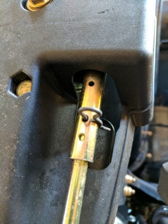 44. Another picture of the guides. If you break a shear pin installing a new one is very easy.  Just take a new one from the storage spot in the dash and quickly replace it. You don’t need any tools to install the new shear pin. Hint: If you are clearing snow and the front end wants to ride up on you stop, turn off the engine and then check the front shear pins.
